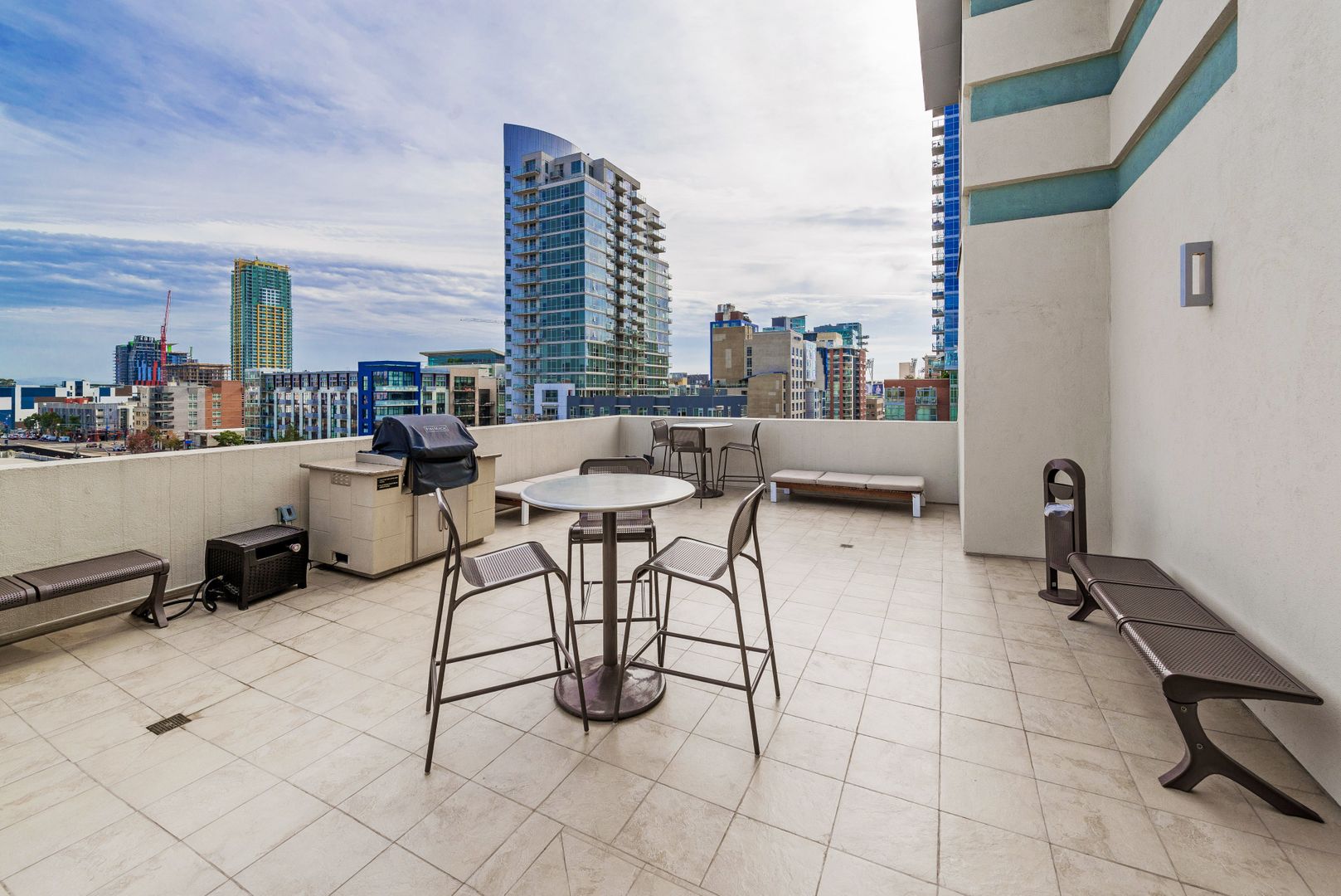 Welcome to this open and spacious residence in the stylish, urban community of Nexus! Banks of windows bring in the natural light and an expansive oversized balcony with city views is the perfect place to relax at the end of the day. Luxury wood flooring, neutral paint tones and custom lighting throughout. The granite and stainless kitchen is intelligently open to the main living area, the ideal set-up for easy living. Two designated, secured parking spaces means parking will be a breeze. Welcome home! Community amenities include a well-equipped fitness center, bike storage area, front desk attendant, and 7th-floor rooftop patio with community BBQ. The Nexus building is conveniently located in thriving East Village near several new restaurants and bars, three blocks from the Gaslamp Quarter, four blocks from Petco Park, near numerous bus & rail routes, Balboa Park, and the Naval Hospital. Easily accessible by trolley to SDSU, USD, Fashion and Mission Valley. It's all here for the discriminating urban dweller! Small pet may be allowed with restrictions and additional deposit, available for immediate occupancy!